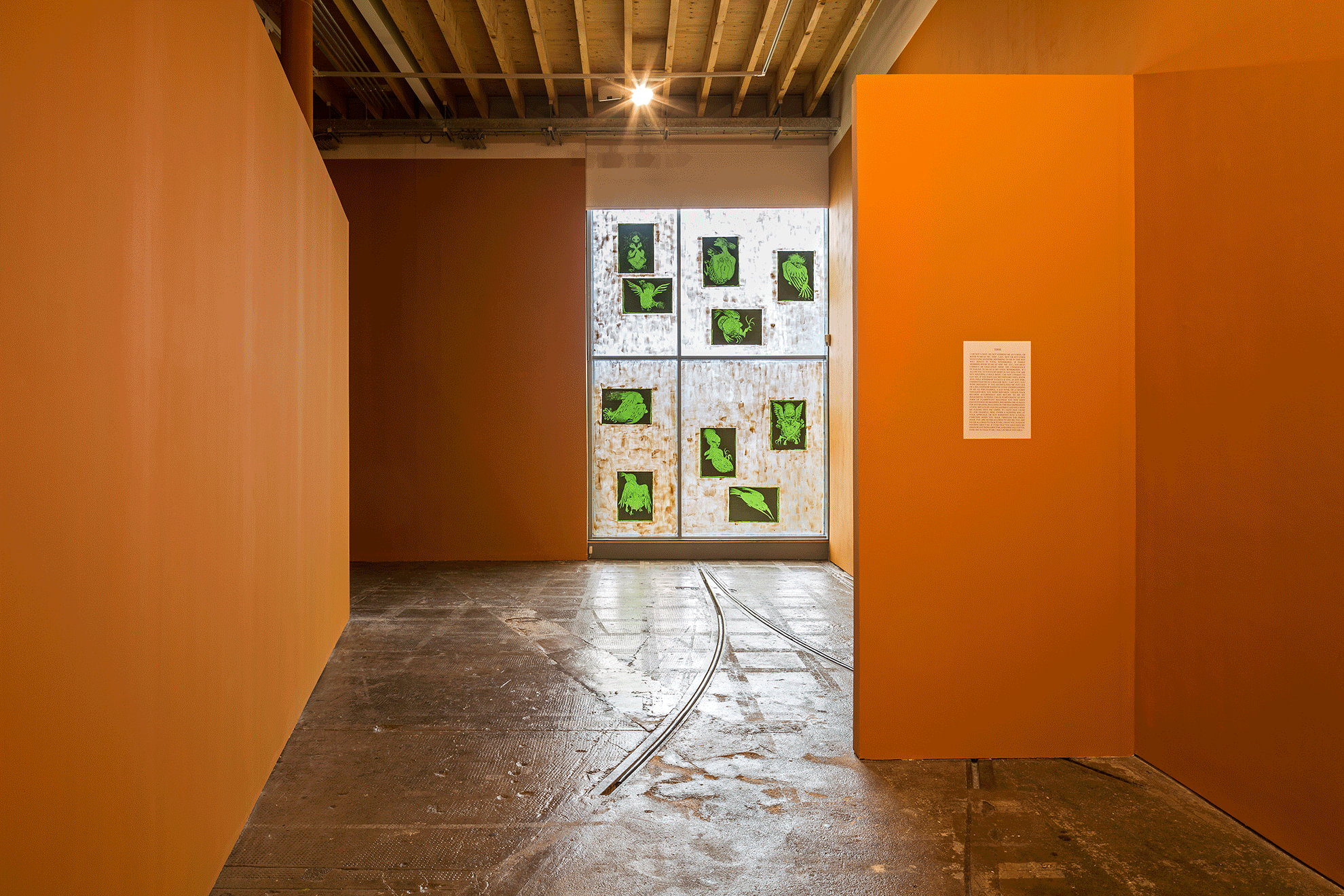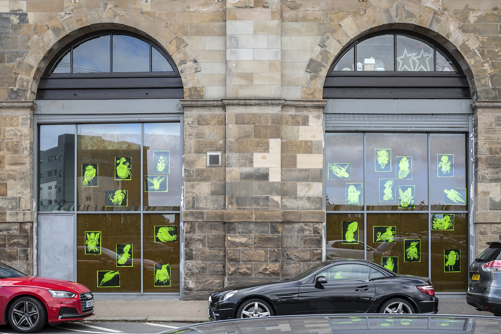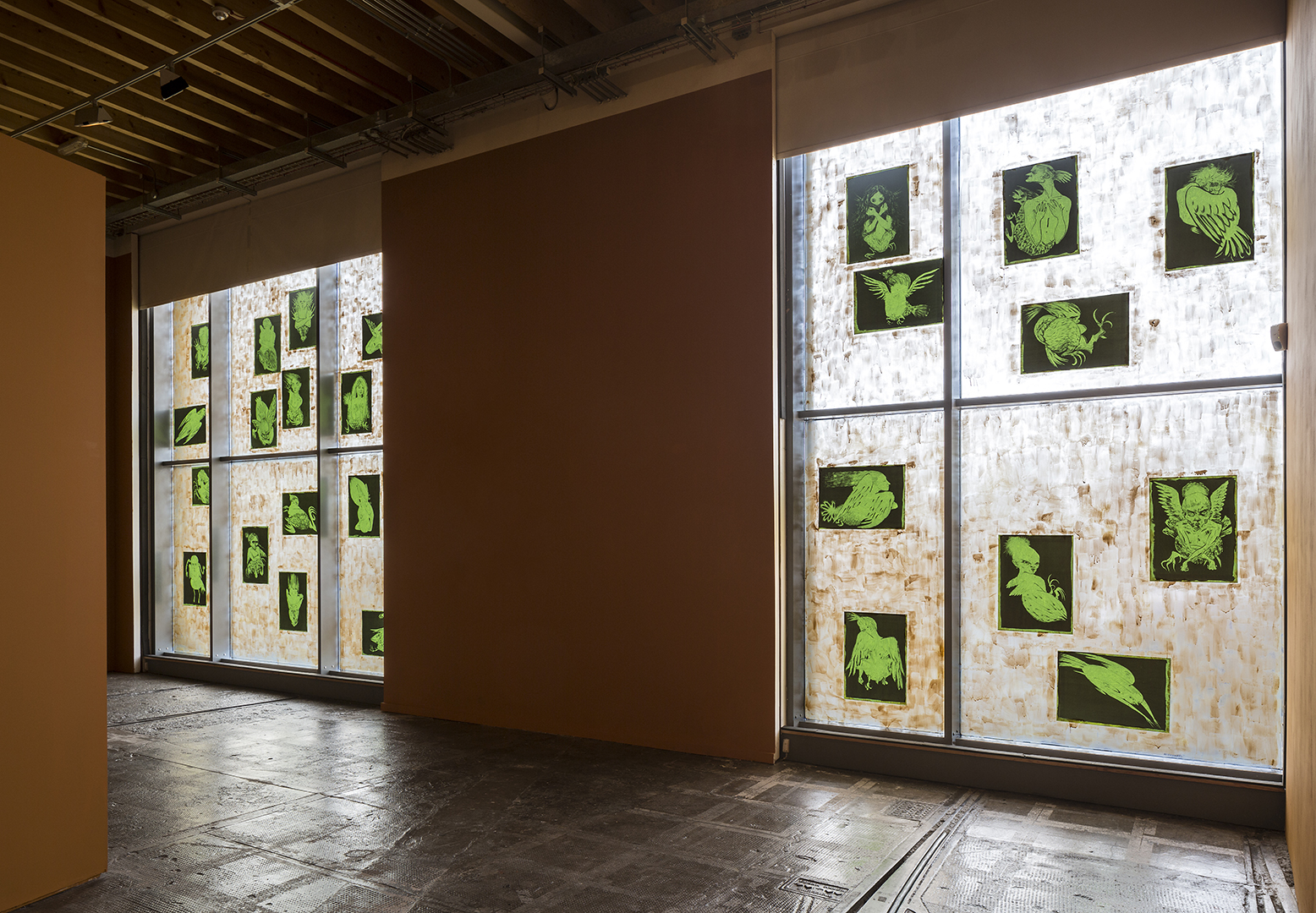 Beyond this, 25 abductresses fills and blocks the windows of the gallery. Digital prints reproduce twenty five ink drawings of demons (or perhaps furies—ancient Greek spirits of vengeance who punished oath-breakers) who appear briefly in the video work Pastoral Drama. They are printed onto fluorescent yellow paper and pasted onto the window, facing outwards, while around them liquid rubber in a shade of ochre brown is sloshed, filling the glass panes. Though they are called ‘abductresses’ (women who abduct), these demons all bear ambivalent expressions, and have postures that hide or distance them from viewers on the street. Still, they have gathered on the window, and come to meet the public, for which they might be accused of seduction. The painted rubber around them hides the interior of the gallery from outside view.