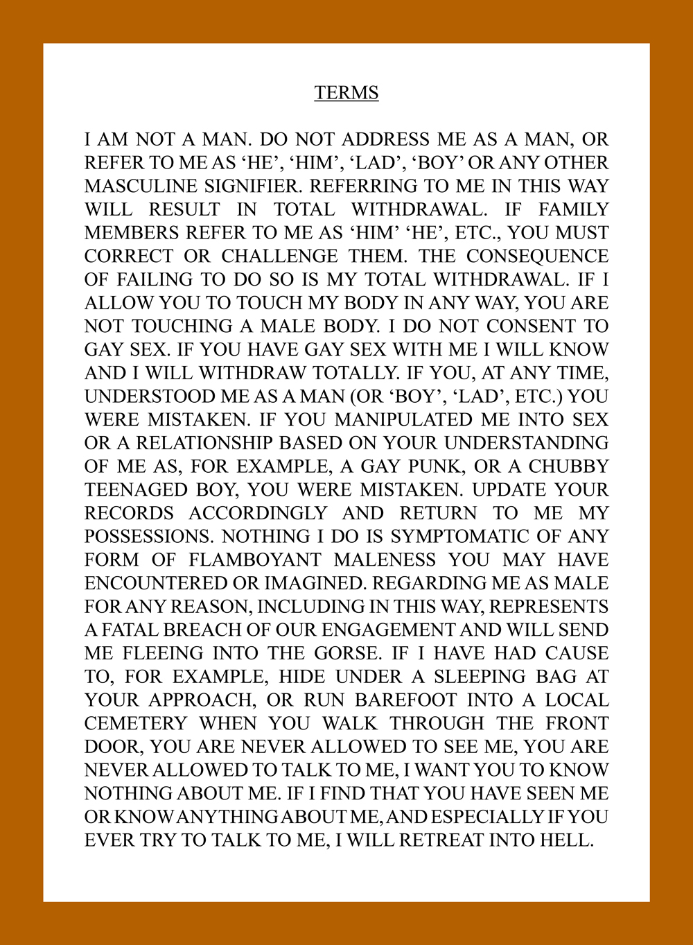 Terms, a 300 word text, is pasted on either side of a small, irruptive wall near the entrance of the gallery. In language which touches on the conventions of rules, contracts, and demands, the text asserts the narrator’s intense desire not be referred to as a man. At different points it seems to be addressed to professional contacts, to family, to romantic partners, to old friends, and to traumatic figures from the past. Throughout these increasingly desperate appeals for personhood, the narrator only has power to threaten one thing; their own withdrawal, which may be pulling out, distancing, dissociating, hiding, or running away.